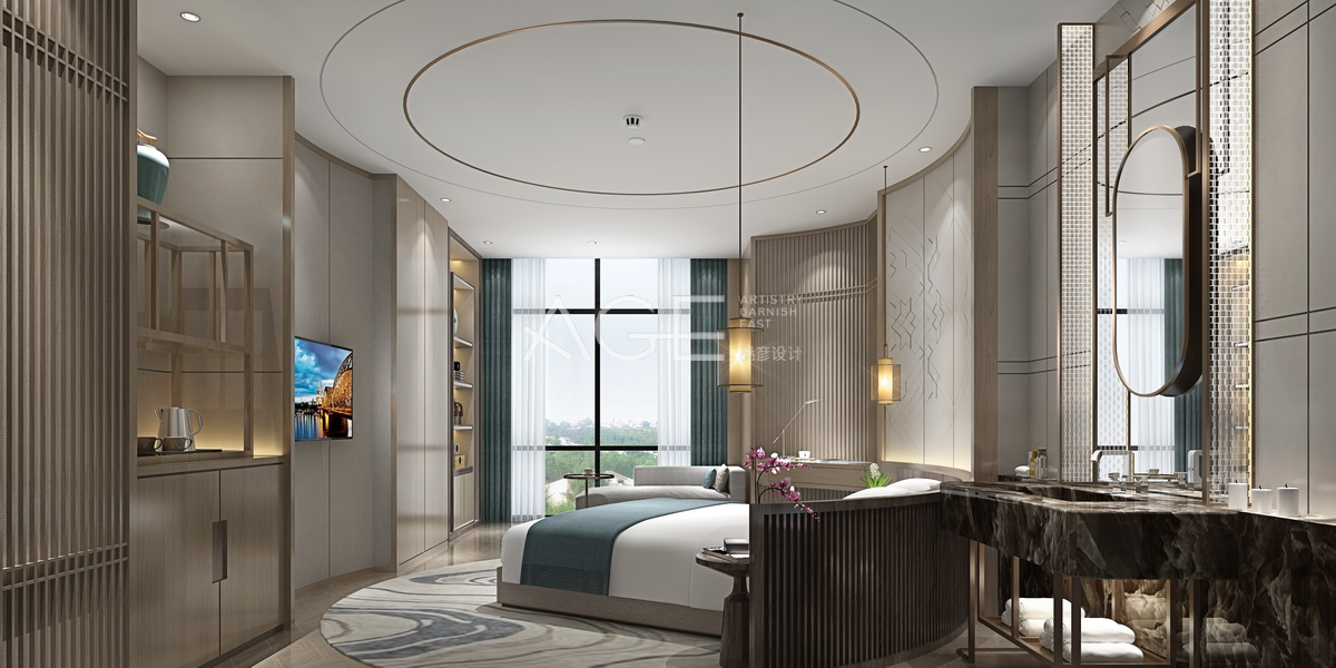 大床房現(xiàn)代與中式結(jié)合的設(shè)計,讓室內(nèi)有了高雅之氣。落地大窗戶,讓空間更顯得明媚亮眼,墻體用線條勾勒出中式元素,再加入現(xiàn)代時尚的細節(jié)設(shè)計,完美的結(jié)合出現(xiàn)代中式的氣勢。天花板和地面上下呼應(yīng)加入圓的設(shè)計,使得大床區(qū)域空間更顯得有立體感。