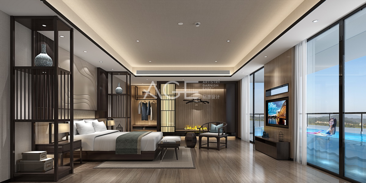 酒店特色房整體設(shè)計現(xiàn)代中式尤為突出,床頭后背景墻設(shè)計的中式風(fēng)格,與床區(qū)域兩側(cè)落地木雕柜設(shè)計相得益彰,木質(zhì)地板與天花板方形設(shè)計呈現(xiàn)相呼應(yīng)的氣勢,中式座椅讓整體空間更顯得古韻氣場,與大床相對應(yīng)的墻體設(shè)計只有一小塊用了實體,兩側(cè)則是落地大窗,左右推開可以去釣魚或者一展游泳的風(fēng)采,從里到外的整體空間顯得實用優(yōu)雅而自然。