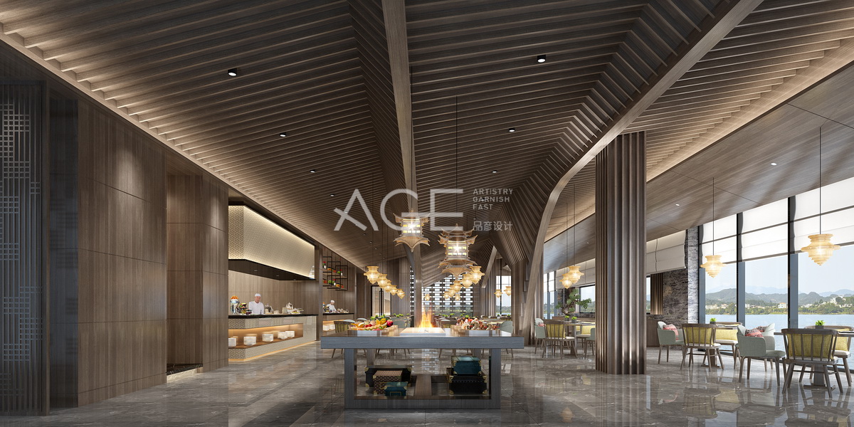 餐廳延續(xù)前廳大堂的風(fēng)格,但又顯出不一樣的美,用個性的柱體設(shè)計區(qū)分出用餐區(qū)和取餐區(qū),天花板階梯式的線條設(shè)計更讓空間有了落差的美。中式藤條元素的餐桌,提升餐廳空間的顯高大上,讓客人享受美食的同時還可以看山看水,瞬間打開想吃的味蕾。
