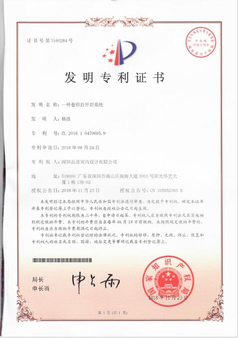2016年6月24日,品彥設(shè)計(jì)首次完成一種卷簾自開啟系統(tǒng)的研發(fā)工作,并在經(jīng)過嚴(yán)密的測試,確認(rèn)達(dá)到使用標(biāo)準(zhǔn)后予以發(fā)表。隨后便向國家申請相關(guān)知識(shí)產(chǎn)權(quán)登記,在國家知識(shí)產(chǎn)權(quán)局經(jīng)過嚴(yán)格的評(píng)審后決定授予我司專利權(quán),并頒發(fā)此項(xiàng)證書。這是品彥設(shè)計(jì)獲得的國家級(jí)發(fā)明專利證書,具備突出的實(shí)質(zhì)性特點(diǎn)和顯著的進(jìn)步。品彥設(shè)計(jì)以“我以你的心呈現(xiàn)世界”為設(shè)計(jì)格言,一直以來都堅(jiān)持原創(chuàng)設(shè)計(jì),并不斷提升自己的研發(fā)能力,帶領(lǐng)行業(yè)不斷向前。