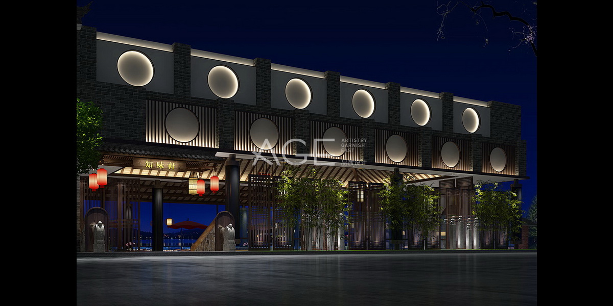 本案作為主題酒店設(shè)計,周邊環(huán)境優(yōu)美僻靜,設(shè)計師秉承“因借環(huán)境、融為一體”的理念,以中式園林的思路精心打造,臨水而建,依木而起,目光所及之處都是令人心曠神怡的風(fēng)景,這也成為本案空間設(shè)計中*大的亮點。商務(wù)酒店的外觀設(shè)計,以廣東中山地區(qū)*常見的建筑風(fēng)格為主,融入嶺南建筑中的“鑊耳屋”、“天井”、“碉樓”、“騎樓”等建筑元素,外墻壁以典型的清水墻作為裝飾,以突出墻面的立柱進行分割,青磚為基礎(chǔ),白色石灰勾縫,并設(shè)置多個圓形圖案,內(nèi)置氛圍燈帶,整個外觀古樸素雅,別具韻味。