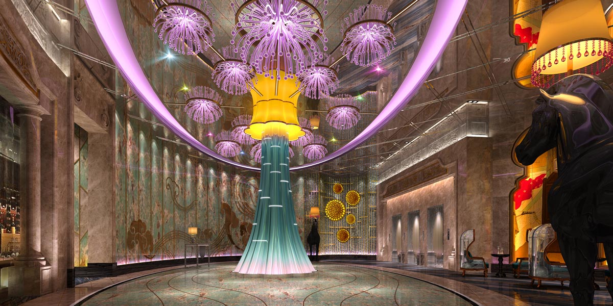 象征“高升”與“如意”的“祥云”、蘊(yùn)意吉祥的“荷花”等裝飾元素與剛硬的玻璃鏡面材質(zhì)混搭卻毫無違和感,傾流如柱的水浪波濤、擊打的浪花、水晶雨簾、