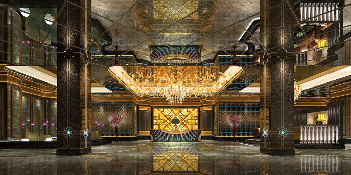 從大廳吧臺(tái)的背景黑桃圖案、立柱上的線條、燈飾的異形造型、玻璃欄桿的羅馬柱等,再到地面大理石花紋,每一個(gè)角落都蘊(yùn)含著“歐式”元素的存在,突出主題印象。大廳中最大亮點(diǎn)要屬天花板的優(yōu)美裝飾,片片金色蝴蝶垂下,簇?fù)碓诤虚g的則是花朵造型的燈飾,蝴蝶仿佛輕盈地在花周?chē)琛R园膳_(tái)為中心,一側(cè)是休息區(qū)域,另一側(cè)則是造型別致的噴泉水池,流線彎曲的金色凹槽,緩緩悠然的水流給人一種放松愉快的感覺(jué)。